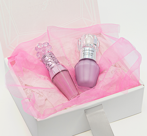 大粒のパープルパールがきらめくサクラピンクのリップ美容液と透明感をあたえるラベンダーの化粧下地ミニサイズの限定メイクセット。